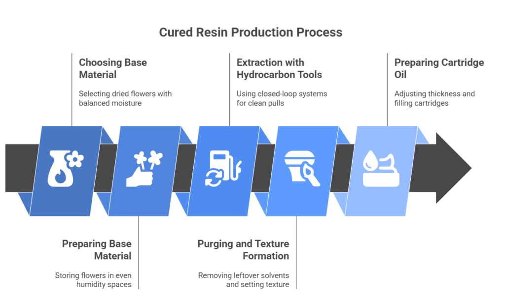 Cured resin comes from dried cannabis flowers that go through a normal curing process. That slow cure shapes the flavor, makes the aroma deeper, and stabilizes the oil. Many U.S. consumers like this format because it feels close to the classic taste of dried flower.